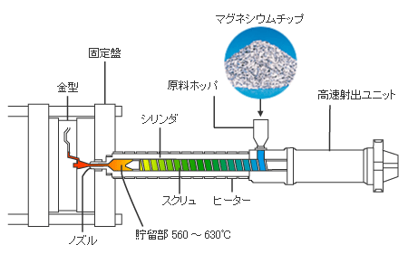 顆粒狀鎂合金切片在圓筒中加熱,并在不暴露于大氣的情況下注塑成模具。